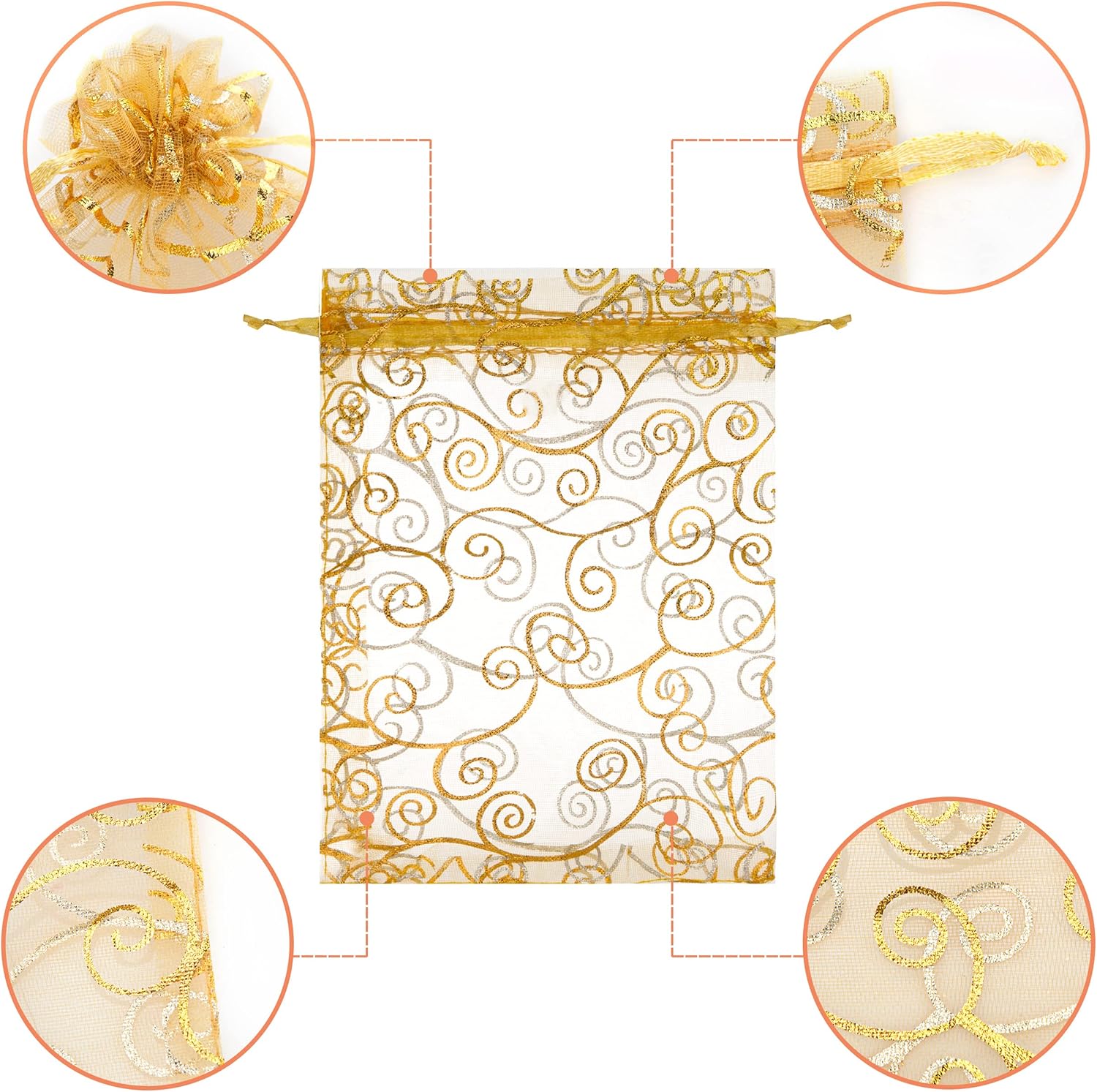 100pcs Organza Gift Bags, 13x18cm Sheer Organza Bag Mesh Favor Bags Drawstring Jewelry Rattan Printed Gift Pouches for Wedding Party Favors Baby Shower Christmas Gifts Candy