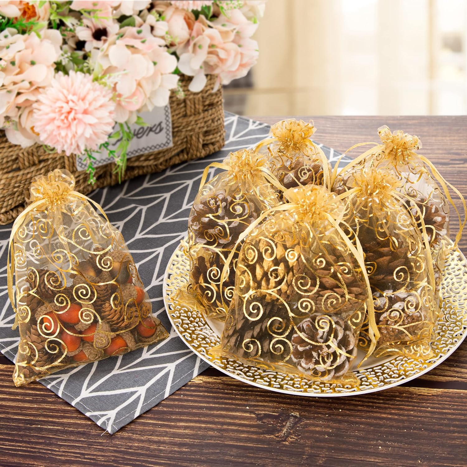 - Weddings and Celebrations: Picture a romantic wedding table adorned with rows of these elegant bags, each holding sweet treats or personalized mementos. The shimmering gold foil patterns add just the right touch of glamour, complementing any décor—be it rustic chic or grand ballroom elegance.
