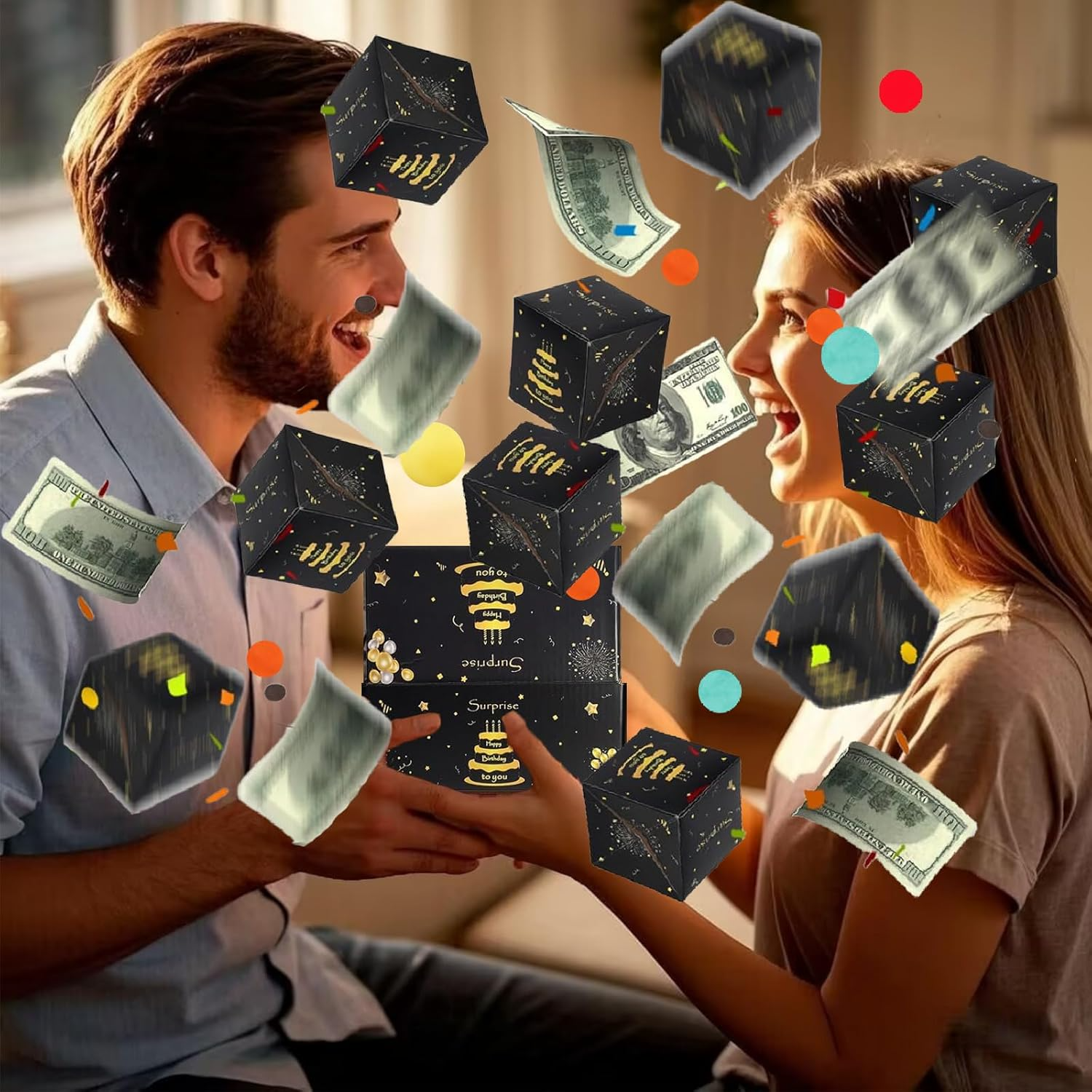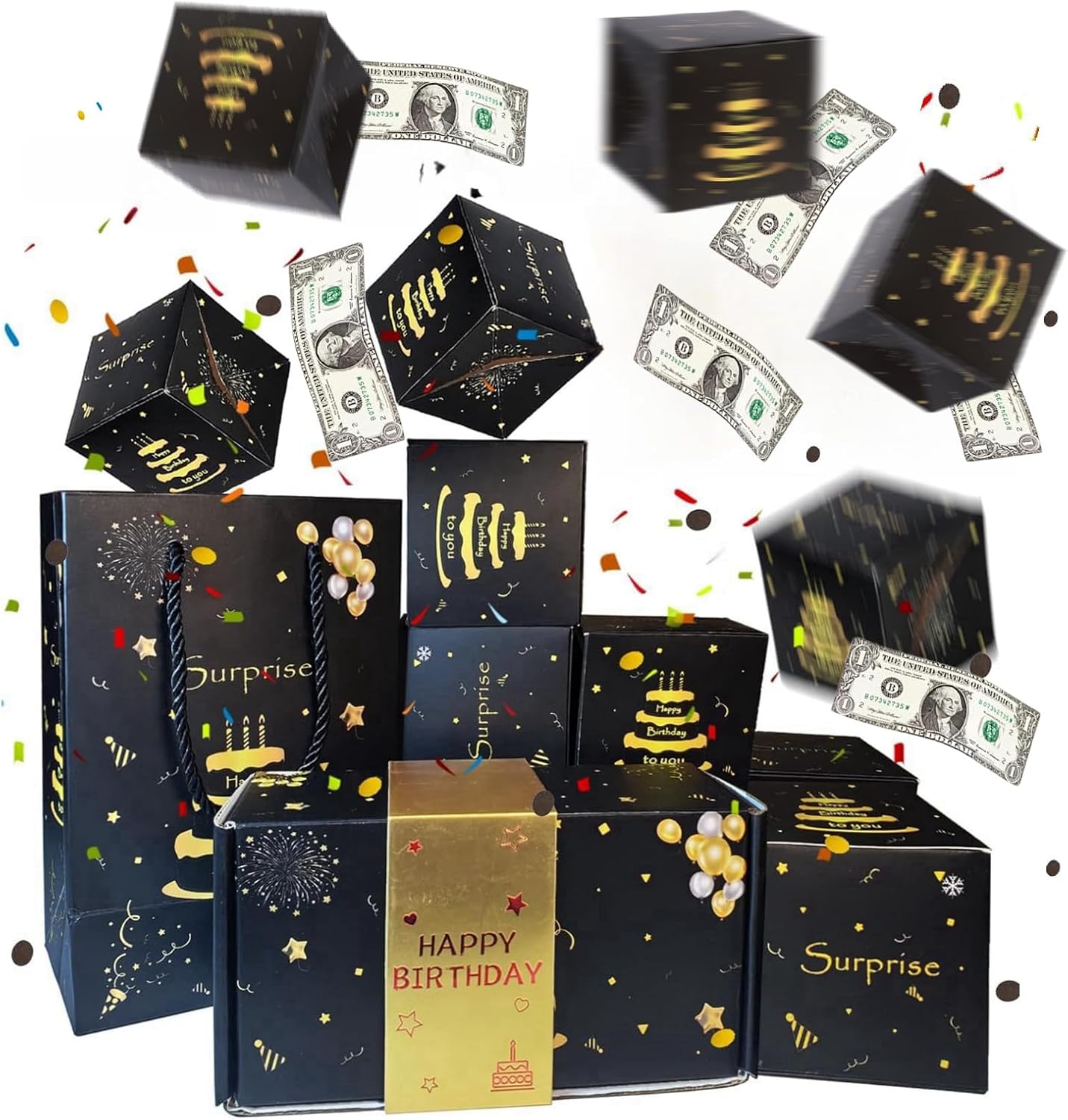 - 🪞Exploding Gift Box🪞 At the birthday party, when you open the happy birthday surprise gift box, the money photos and blessings inside will instantly jump out, instantly igniting the atmosphere and making everyboday feel surprised and joyful.