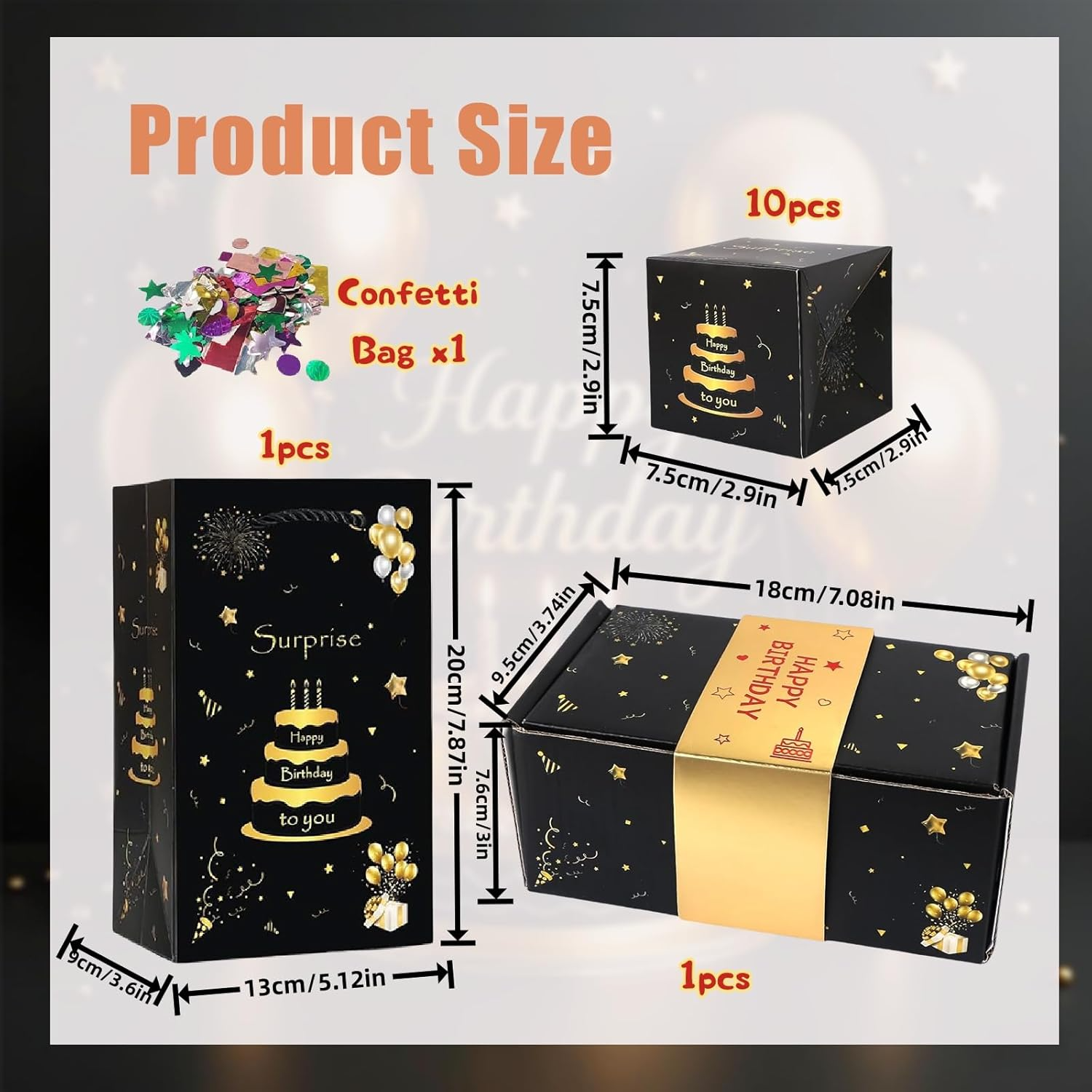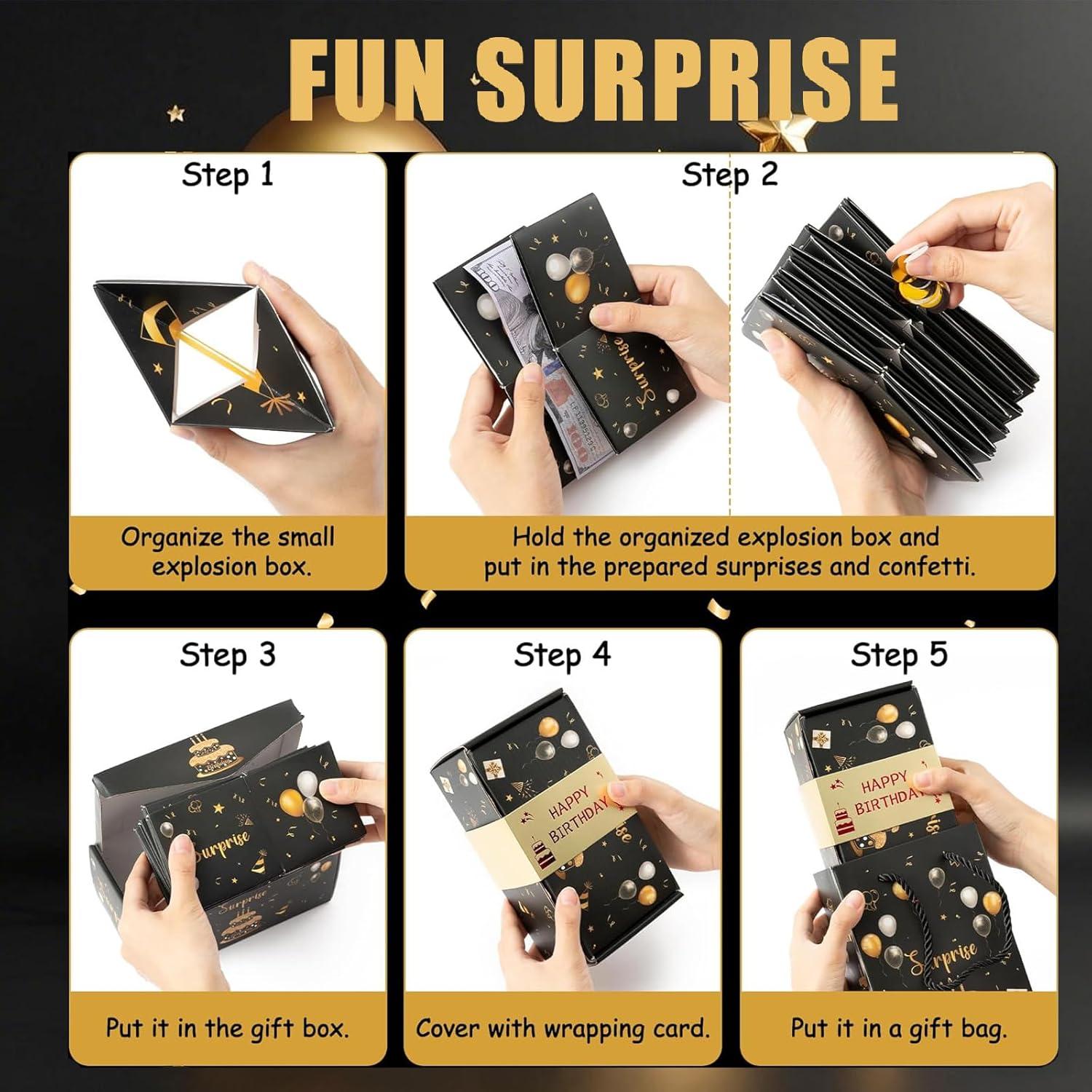 - 🍃Easy DIY🍃Our happy birthday explosion boxes have been pre-assembled with rubber bands, all you need to do is to put cash, photos, confetti, cards, necklaces, bracelets, candies and so on into the surprise box to create an exclusive surprise.