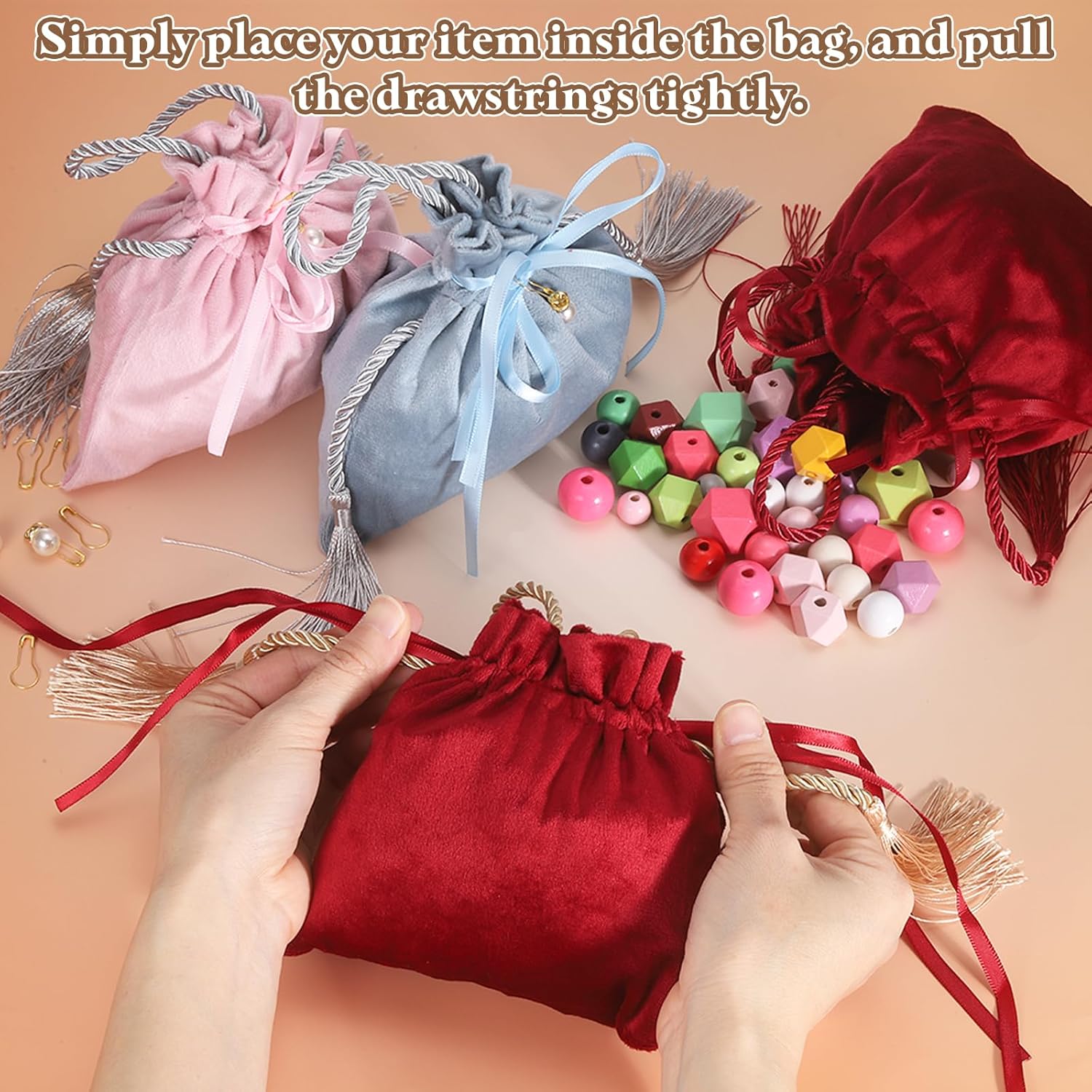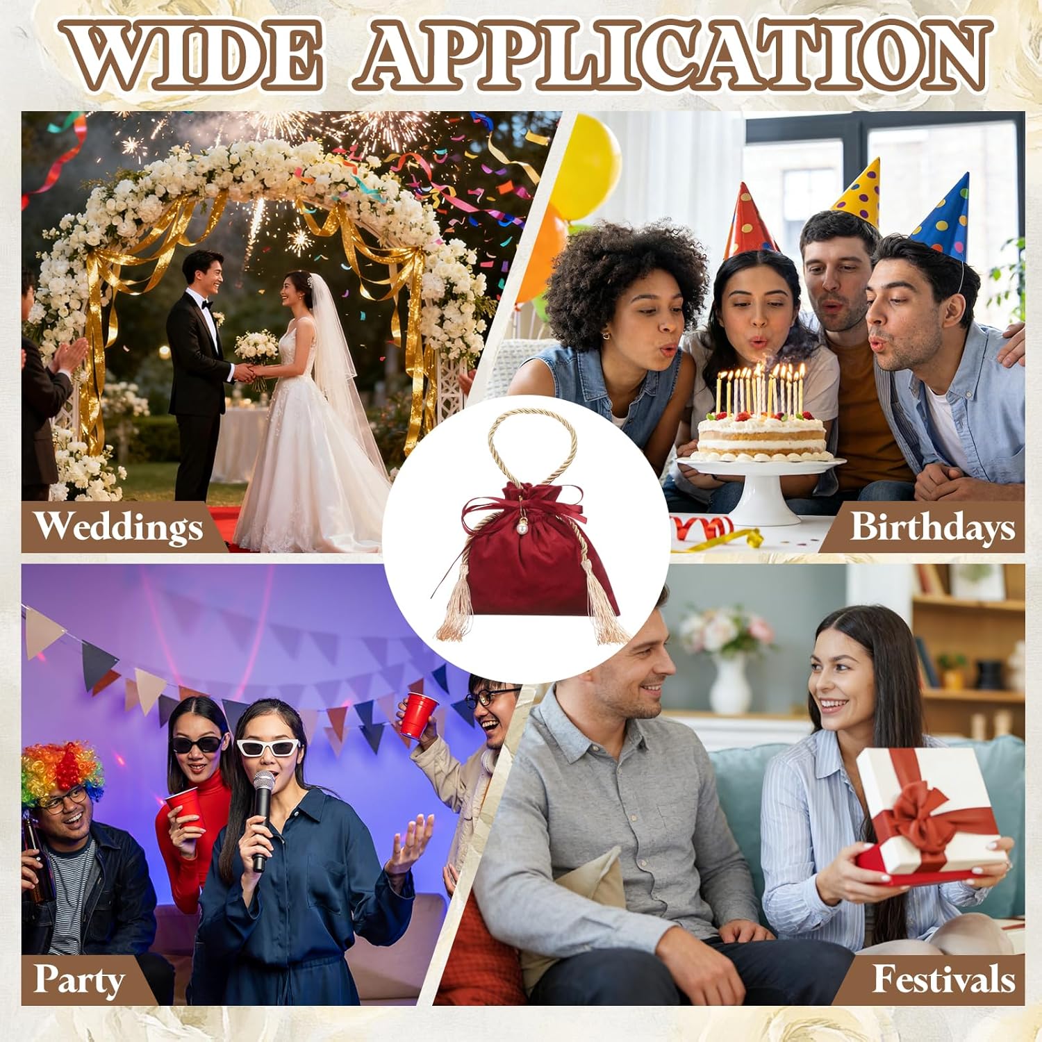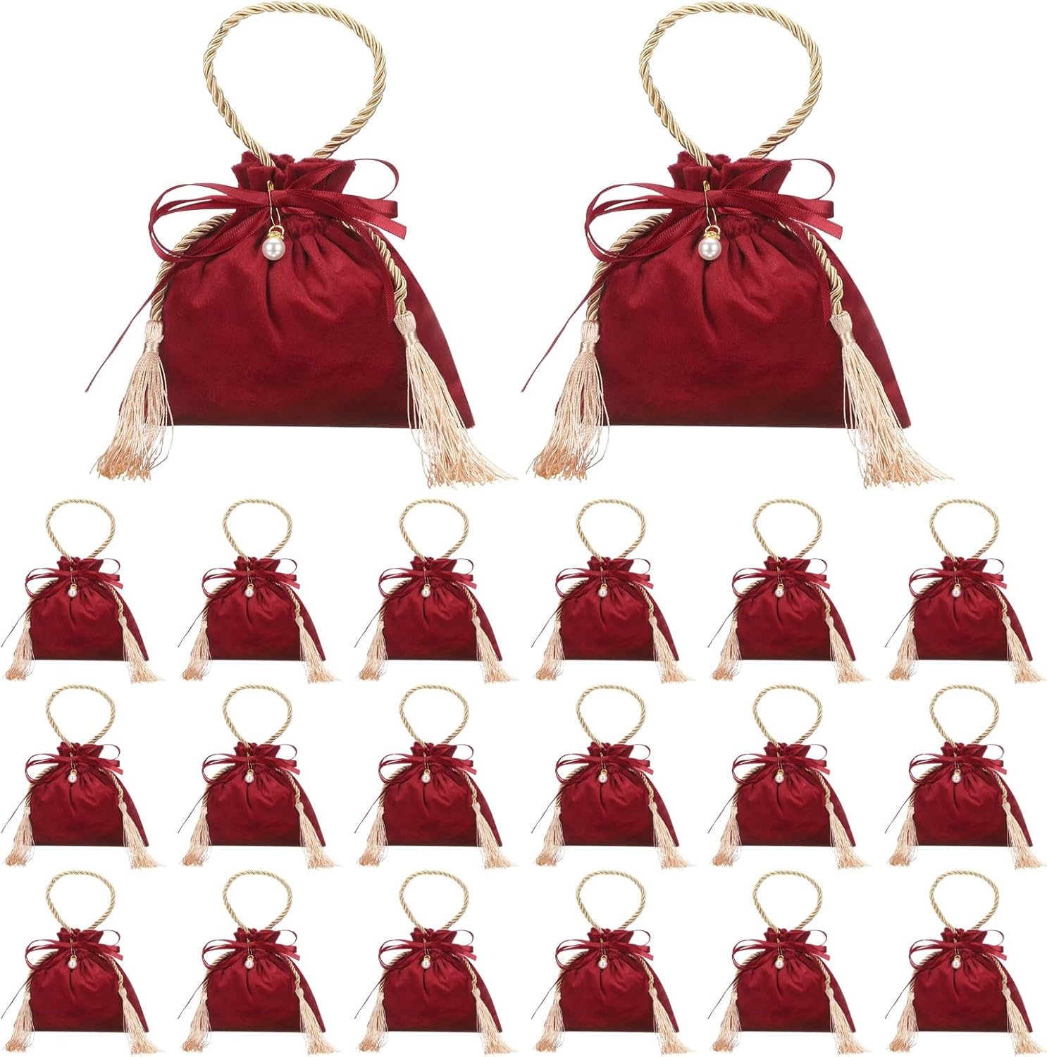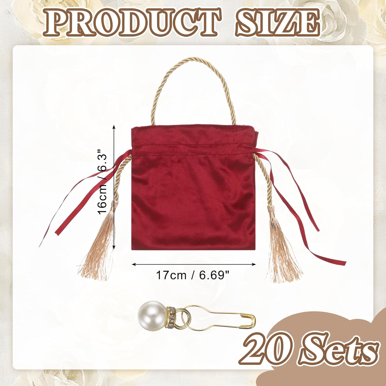Velvet Drawstring Bags, (6.3 x 6.7 Inch, Dark Red/Yellow) (20 Pcs), Flannel Jewelry Bags with Pearl and Tassel Mini Candy Packaging Storage Pouches, Suit for – Wedding/Favor/Party