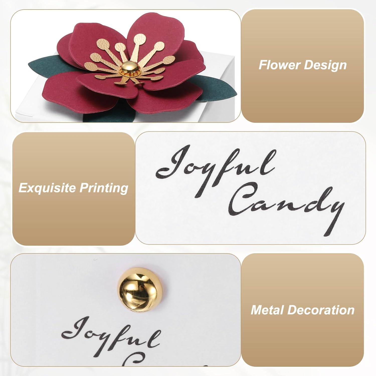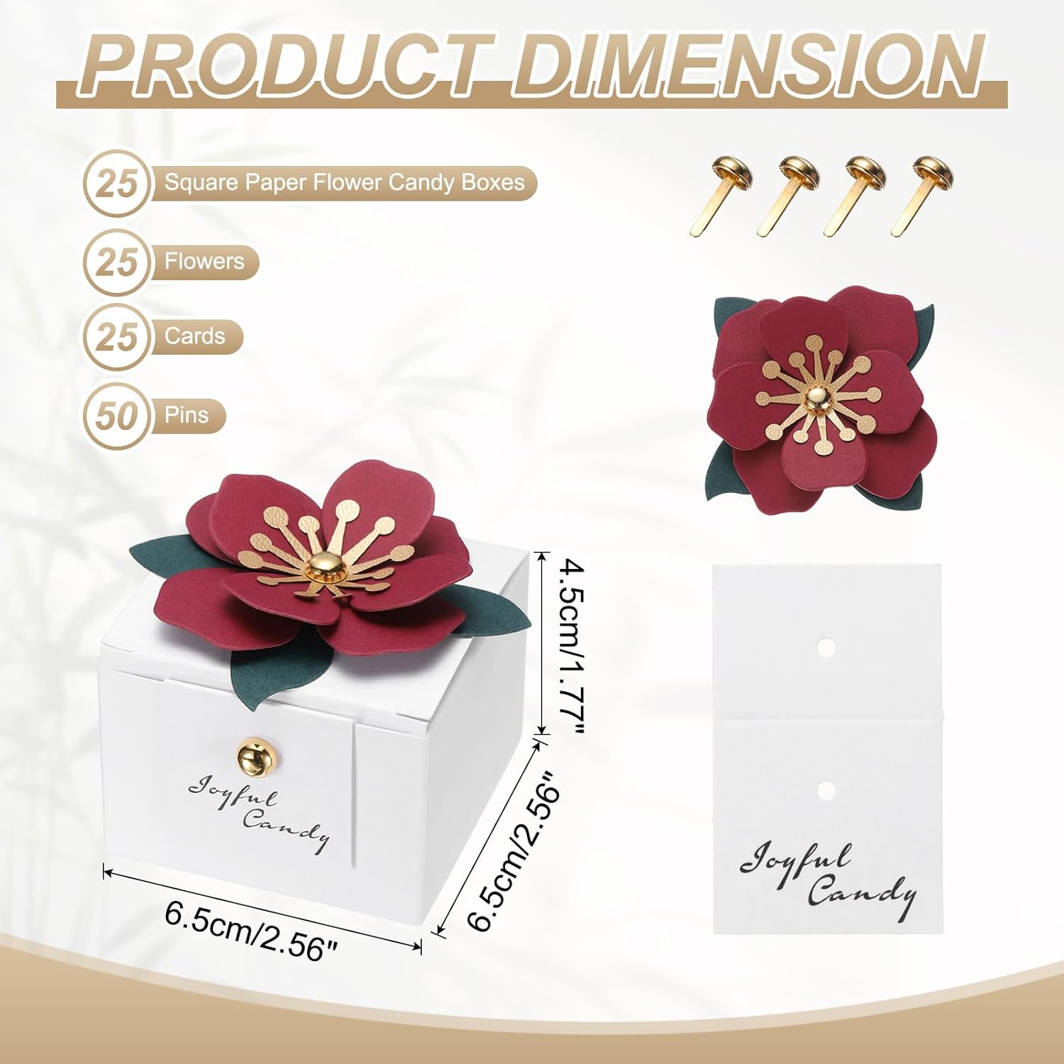 Wedding Favor Boxes, (2.5 x 2.5 Inch, White)(25 Pcs), Square Paper Flower Candy Boxes with Dark Red Floral Decor Thanks Card, Suitable for Wedding/Birthday/Party/Decorations/Gift